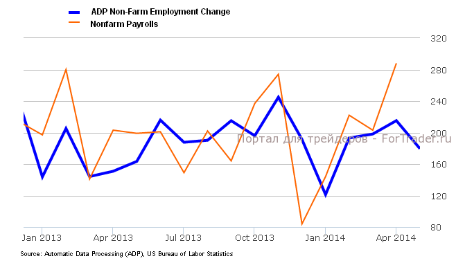 В то же время, данные по занятости от ADP и торговому балансу США вышли в среду хуже ожиданий. Согласно данным компании Automatic Data Processing (ADP), число новых рабочих мест в частном секторе США в мае выросло лишь на 179 тыс., по сравнению с пересмотренным в сторону понижения показателем за предыдущий месяц на уровне 215 тыс. и прогнозом 210 тыс. Прирост занятости оказался наименьшим за 4 месяца. В пятницу министерство труда США представит официальный отчет по занятости. Как ожидается, число новых рабочих мест (Non-Farm Payrolls) в мае выросло на 218 тыс. против 288 тыс. в апреле, а безработица повысилась на 0,1% до 6,4%.