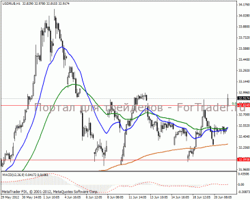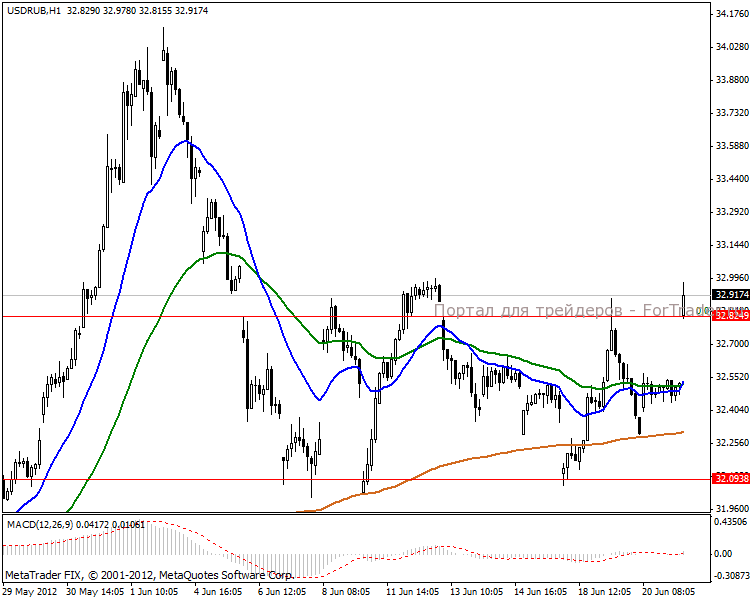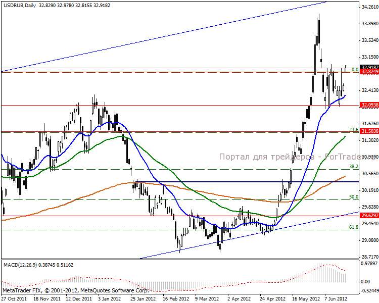 В ближайшее время на пару usd/rub основным движущим фактором будет макроэкономический фон из США, поэтому отметим, что Федеральная резервная система приняла решение сохранить ключевую учетную ставку в диапазоне 0-0.25% годовых, говорится в сообщении, распространенном по итогам завершившегося заседания Комитета по операциям на открытом рынке. Согласно прогнозу ФРС, рост ВВП страны в текущем году не превысит 2.4%. В ближайшие годы будут наблюдаться более слабый уровень безработицы и замедление инфляции. Прогноз роста ВВП в текущем году колеблется от 1.9 до 2.4% в отличие от предсказанных в апреле 2.4-2.9%. В 2013 году рост ВВП предположительно составит 2.2-2.8% вместо ожидавшихся ранее 2.7-3.1%. В 2014 же году подъем показателя, согласно прогнозу, достигнет 3-3.5%.