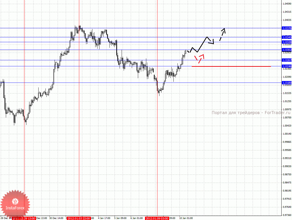 По паре Австралийский доллар/Доллар ключевыми уровнями являются: 1.0376, 1.0345, 1.0328, 1.0302, 1.0267, 1.0246 и 1.0189. Здесь возле уровня 1.0302 мы ожидаем консолидацию, после чего движение к 1.0328, в коридоре 1.0328 – 1.0345 также консолидация цены. Потенциальным значением для верха считаем уровень 1.0376. Краткосрочное нисходящее движение возможно в диапазоне 1.0267 – 1.0246, пробой последнего значения будет располагать к развитию нисходящей структуры, в данном случае потенциальная цель 1.0189.
