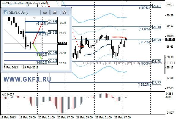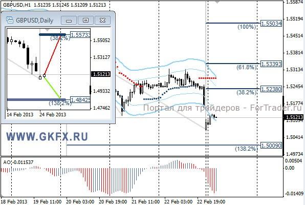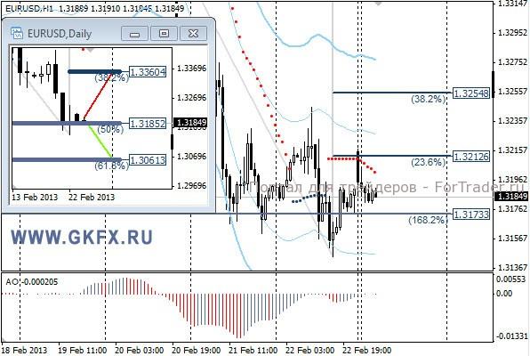 Пара EURUSD начала день на оптимистичной ноте после сильных данных Ifo, но сообщения ЕЦБ о меньших выплатах по LTRO столкнули пару вниз. Также сильно разгуляться курсу не дали ожидания выборов в Италии, которые проходят в данный момент. По рекомендации сработал стоп-лосс. На прошедшей неделе отработал зеленый прогноз. На этой неделе рассматриваю традиционно два варианта возможного движения цены, основной красный и альтернативный зеленый, склоняюсь к красному. Значимые уровни на сегодня отмечены на часовом графике. Индикатор АО у нулевой отметки, указывая на неопределенность. Индикатор тренда указывает на снижение. Следует посмотреть на настроение рынка сегодня. Вне рынка.