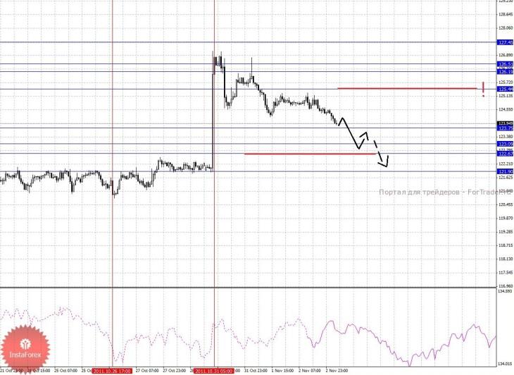 По паре Фунт/Йена ключевыми уровнями являются: 127.45, 126.51, 126.19, 125.44, 123.75, 123.09, 122.67 и 121.90. Здесь продолжения движения к низу, ожидаем после пробоя 123.75, в данном случае цель 123.09, в коридоре 123.09 – 122.67 консолидация цены. Потенциальным значением для низа, считаем уровень 121.90, по достижении которого, ожидаем откат к верху. Уровень 125.44 является ключевой поддержкой для низа, его пробой будет располагать к развитию восходящей структуры от 26 октября, в данном случае цель 126.19, в коридоре 126.19 – 126.51 консолидация цены. Потенциальным значением для верха, считаем уровень 127.45, движение к которому, ожидаем после пробоя 126.51.