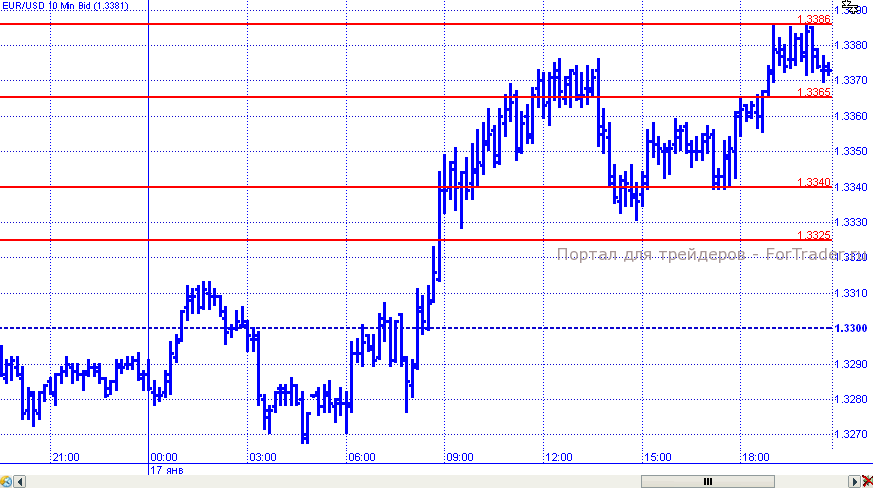 Начнем с уже традиционно описания настроя и интересов инвесторов. За прошедший день внимание игроков переключилось на скорое заседание по монетарной политике Банка Японии (состоится 21-22 января), а также временное разрешение проблемы с госдолгом США. Если быть точным, это еще не разрешение, а лишь слухи о том, что временное соглашение достигнуто. Однако и этого достаточно (вкупе с комментариями Fitch о том, что пока рейтингу Штатов ничего не грозит), чтобы вновь вернуть спрос на активы и подготовить благоприятную обстановку для новой атаки EUR/USD на 1,34. В случае очень вероятного прорыва, пара может пройти сразу на 20-30 пунктов выше, так как в этом районе сосредоточено немало стопов. Кстати, превышение прогнозов по ВВП Китая может стать прекрасным катализатором указанного прорыва.
