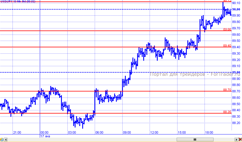 Официальные лица Японии все же добились своего. После попытки снова закрепиться ниже поддержки на 88,35 (цены снизились к 88,11) пара возобновила рост. И не просто возобновила, а преодолела ранее отмеченный максимум на 89,66 и «пощупала» уровень 90,00. Цены достигали отметки 90,12, но все же к закрытию торгового дня откатились к 89,90.