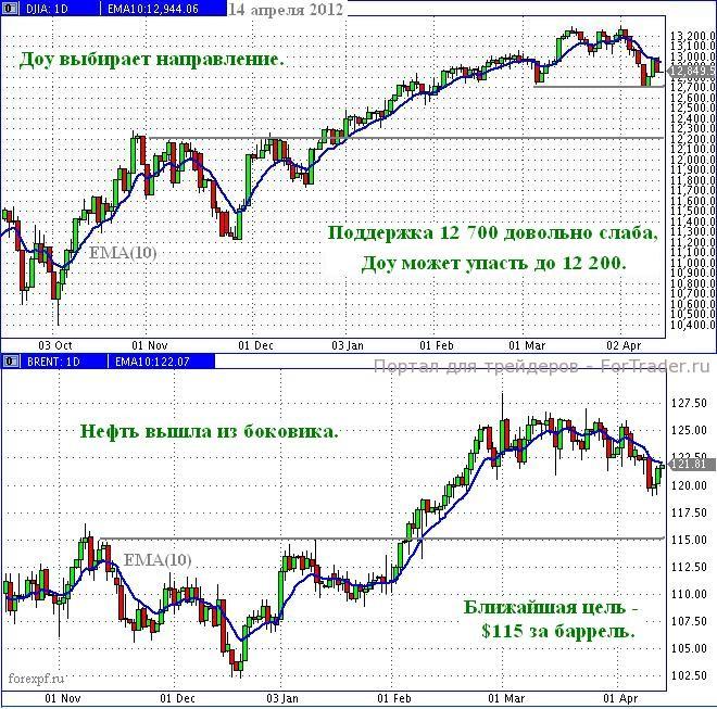 С декабря прошлого года на дневном графике индекса Доу-Джонса скользящее среднее ЕМА(10) рисовало линию тренда с наклоном вверх. И хотя уже в феврале чувствовалось сомнение в поддержке восходящей тенденции, тем не менее, практически все свечи оставались выше ЕМА. Рынок оказался в состоянии неустойчивого равновесия. В начале марта «медведи» провели неудачную атаку, но всё же опустили Доу ниже линии тренда до уровня 12 700. В начале апреля продавцы действовали более агрессивно: пять торговых сессий подряд рынок активно падал. В результате скользящее среднее явно развернулось вниз: «медведи» сломали восходящий тренд. Упав до уровня 12 700, соответствующего мартовскому минимуму, Доу, в полном соответствии с правилами технического анализа, совершил коррекцию. И тоже по всем правилам: откатившись к ЕМА, имеющему наклон вниз, в пятницу, 13 апреля, индекс продолжил падение.