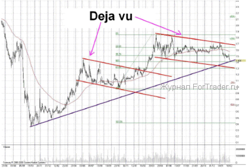 Сегодня подруга-трейдер задала мне вопрос, не страшно ли покупать бумаги, ведь видно, что тренд по ним явно нисходящий? Страшно, но я смотрю шире — ориентируюсь на восходящий тренд от октября 2008 года. Учитывая тот факт, что я дроблю покупку, то цены и срок инвестирования мне позволяют поставить стоп за уровнем 1,3 рубля (линия поддержки нисходящего канала от апреля 2010 года и линия коррекции по Фибоначчи 61,8% к росту котировок от ноября 2009года – по апрель 2010 года).