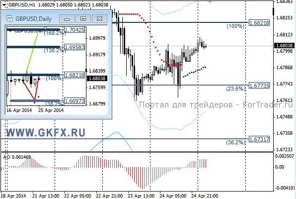 Пара EURUSD в начале европейских торгов росла на сильных данных Ifo. Затем резко снижалась на лучше, чем ожидалось данных по США, но быстро вернула утраченные позиции. Связывают снижение доллара с обострением ситуации в Украине, где произошло столкновение военных с протестующими и в результате имеются жертвы. Реакция России, это возобновление учений около Украинской границы и резкие заявления о военном вмешательстве в случае угрозы жизни жителям юго-востока Украины. Прицел участников рынка вновь смещается на Украину. На эту неделю традиционно рассматриваю два варианта возможного движения цены, основной красный и альтернативный зеленый. Значимые уровни на сегодня отмечены на часовом графике. Индикатор АО находится в положительной зоне и снижается, указывая на коррекцию перед возможным продолжением роста. Индикатор тренда указывает на рост. Вне рынка.