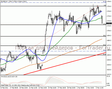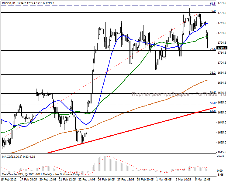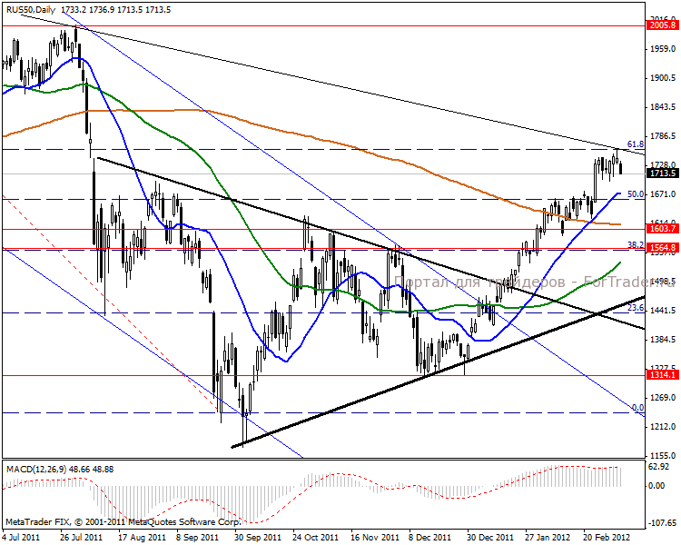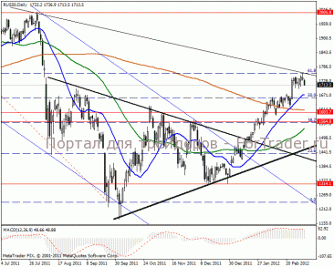 На дневном графике ожидаем направление к 50% уровню Фибоначчи в отметке 1660 пунктов. Среднесрочная перспектива так же в нисходящей тенденции, возможен и разворот в направлении 1564 пункта. MACD плотно закреплен в положительной зоне и говорит о взятии восходящей цели 1815 пунктов.