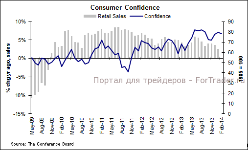 Согласно данным частной исследовательской группы Conference Board, индекс потребительского доверия в США в феврале снизился до 78,1 п., с пересмотренного вниз январского значения 79,4 п. Индекс прогнозировался на уровне 80 п. Индекс текущих условий достиг в феврале самого высокого значения почти за шесть лет, в то время как индекс ожиданий резко упал.
