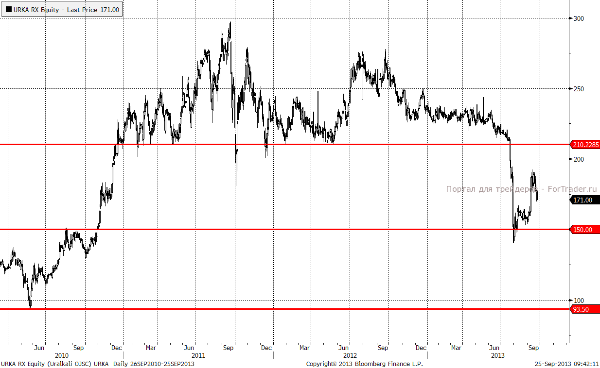 Уралкалий. Приход Китайских инвесторов в крупнейшее в мире предприятие по производству удобрений прошло без эмоциональной окраски. Цены несущественно снижаются, но это в пределах снижения российского рынка в целом. На наш взгляд, в среднесрочной перспективе будет продолжаться боковое движение в рамках диапазона 150 – 210 руб. за акцию.