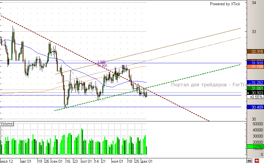 Рубль к доллару сегодня теряет целых 15 копеек. Снижение выглядит пока больше как технический отскок, после того как покупатели рубля не смогли пробить отметку 30,7. Других факторов для снижения российской валюты сегодня нет – межбанковские ставки все еще высоко, а нефть торгуется вблизи вчерашних цен закрытия. Среднесрочные перспективы нефтяных котировок, правда, достаточно туманны, т.к. запасы в США продолжают расти, а геополитических рисков сейчас не наблюдается. Именно фактор снижения нефти будет давить на котировки рубля в ближайшем будущем и, скорее всего, мы скоро увидим очередную попытку опустить рубль ниже отметки 31.