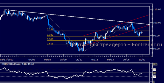 Цены отскочили от поддержки на отметке 89.44, 38,2% расширение Фибоначчи, и начали тестировать область 23,6% при 93.60. Прорыв вверх будет направлен на дно восходящего канала, установленного в начале июля (96.22). Прорыв ниже поддержки будет направлен к отметке 50% уровня Фибоначчи при 86.04.