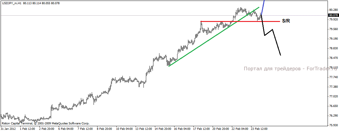 Трендовая линия все же была пробита. Однако снижение цены носит ярко выраженный коррекционный характер. Плюс ко всему, имеется уровень поддержки, от которого наблюдается отбой. Все это указывает на ложность пробоя линии тренда, значит в дальнейшем нас ожидает продолжение восходящего движения пары.
