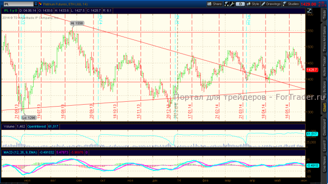 Рынок платины снизился до уровня 1425$ и продолжает выглядеть негативно. Данное движение можно расценивать как коррекцию вниз при сохранении сильного фундаментального фактора. Коррекция может продолжиться до уровня 1400$.