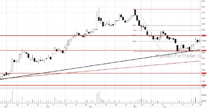 Рассмотрим акции Полюс Золота с позиции технического анализа. С начала текущего года котировки торгуются в рамках нисходящего тренда. Найдя локальный уровень поддержки на 1 620 р. котировки продемонстрировали технический отскок. Ближайшей целью дальнейшего отскока будет служить уровень коррекции 38,2% по Фибоначчи в районе 1 750 р.