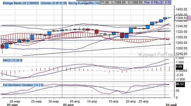 Индикатор Bollinger Bands сигнализирует о развороте от нижней границы среднесрочного динамического канала на 1300 пунктов, текущая верхняя граница проходит через уровень 1370 пунктов, при этом котировки пробивали верхнюю границу.