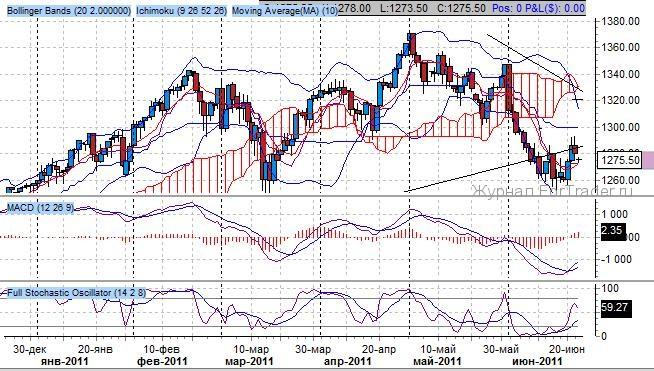 Индикатор Bollinger Bands сигнализирует о развороте от нижней границы среднесрочного динамического канала на 1260 пунктов, техническая цель – середина канала, которая проходит через уровень 1300 пунктов.