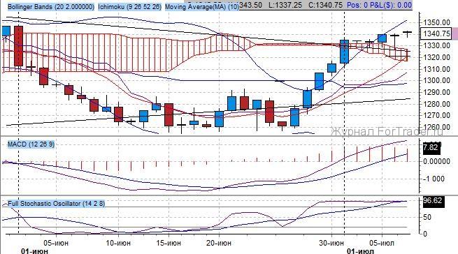 Индикатор Bollinger Bands сигнализирует о развороте от нижней границы среднесрочного динамического канала на 1260 пунктов, техническая цель – верхняя граница канала, которая проходит через уровень 1300 пунктов, достигнута, далее наступил тест понижательного уровня на 1320 пунктов. Максимум на 1335 пунктов.