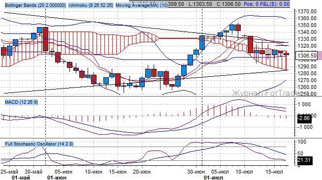 Индикатор Ишимоку отражает наличие среднесрочного повышательного тренда, так как ключевые средние индикатора, образовавшие поддержку на 1300 пунктов, находятся в бычьем пересечении. Быстрая скользящая средняя направлена горизонтально, медленная – горизонтально – признак коррекции тренда, при этом котировки находятся внутри Облака Ишимоку.