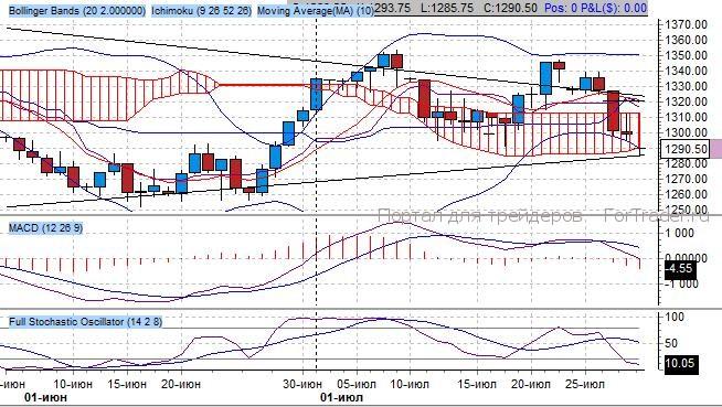 Индикатор Bollinger Bands сигнализирует о реализации разворота к нижней границе среднесрочного динамического канала на 1290 пунктов – техническая цель и сигнал для завершения продаж.