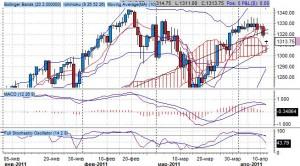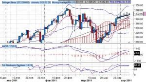 Индикатор Bollinger Bands сигнализирует о развороте от нижней границы среднесрочного динамического канала на 1260 пунктов, верхняя граница проходит через уровень 1345 пунктов, при этом котировки уже достигали верхней границы среднесрочного канала на 1335 пунктов.