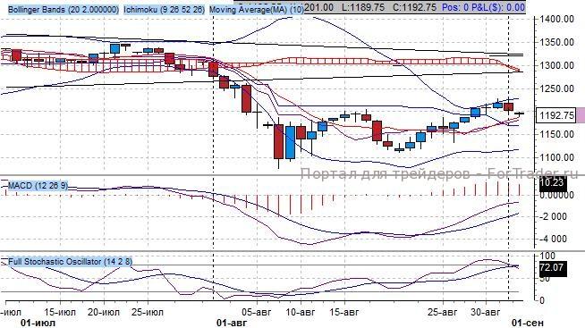 Индикатор Ишимоку отражает наличие повышательного тренда, так как ключевые средние индикатора, образовавшие проторгованное основание на 1180 пунктов, находятся в бычьем пересечении. Быстрая скользящая средняя направлена повышательно, медленная – горизонтально – признак становления тренда, при этом котировки находятся под Облаком Ишимоку.
