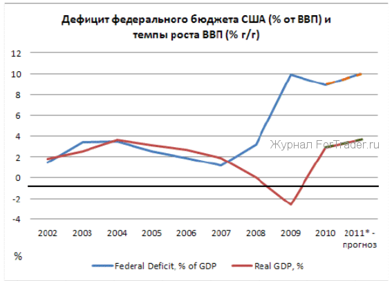 Давайте посмотрим на график объема дефицита бюджета США и динамику ВВП за последние годы. Как мы видим, до 2007 года, несмотря на необходимость печатать деньги из-за дефицита бюджета, ситуация была стабильна, поскольку рост ВВП компенсировал новую эмиссию долларов, вызванную дырой в казне. Но с началом кризиса ситуация резко изменилась: темпы роста ВВП не «покрывают» даже половины бюджетной эмиссии. В итоге, в данном случае вполне обоснованно можно говорить о «необеспеченных» долларах.