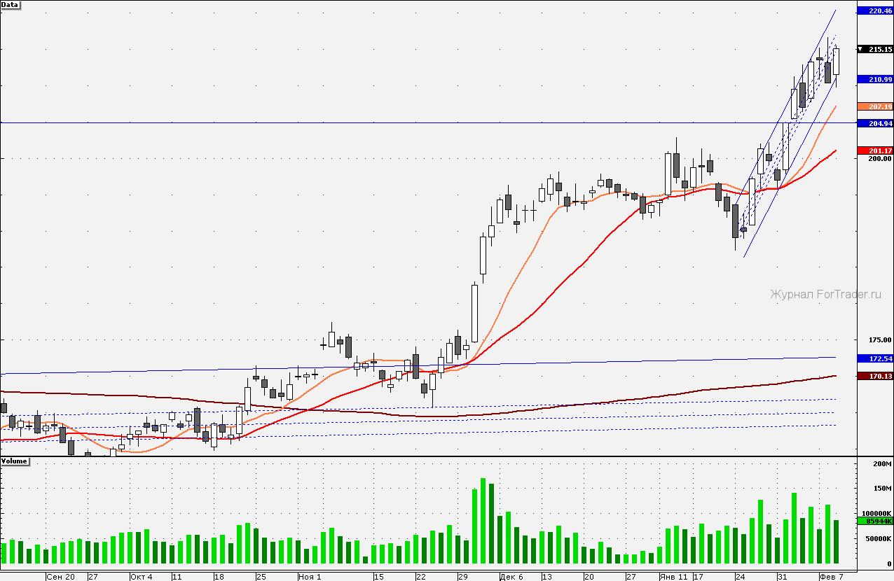 Внешние сигналы для акций российской «нефтянки» носят умеренно-позитивный характер, так фьючерс на Brent торгуется на 1,8% выше уровней окончания торгов на российском рынке акций накануне, но данный фактор может лишь на открытии поддержать котировки акций нефтегазового сектора. Ближайшее сопротивление по акциям «Газпрома» лежит на верхней границе ценового коридора (215,8 руб.), сформированного в рамках краткосрочного восходящего канала. Поддержкой по акциям сегодня может выступить нижняя граница восходящего канала.