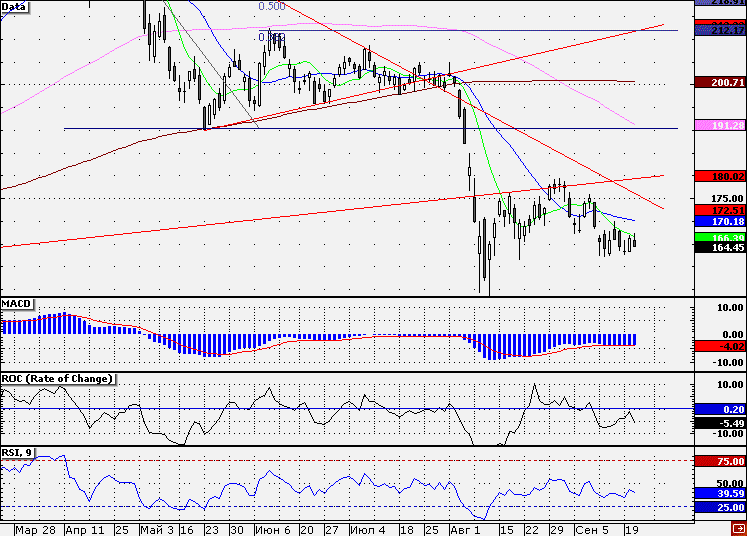 В ходе вчерашней сессии акции эмитента протестировали сопротивление на уровне 167 руб., которое вновь не поддалось котировкам. Негативный внешний фон, сложившийся сегодня будет способствовать переписыванию сентябрьского минимума, что подразумевает спуск бумаг ниже 162 руб. Закрепление ниже данной отметки поставит психологическую цель на уровне 160 руб.