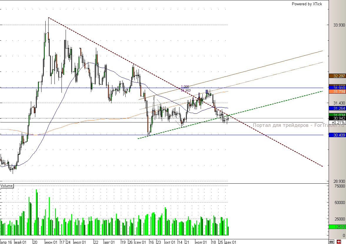 Российский рубль снижается к доллару на 8 копеек. Рубль подошел к своей серьезной поддержке на отметке 31, и если закрепление выше нее не состоится, то в ближайшее время мы сможем увидеть продолжение роста российской валюты вплоть до 30,4. Дополнительным сигналом к походу на 30,4 станет пробой 30,7. Высокие цены на нефть, которые впрочем, сегодня теряют 0,3% по сорту Brent, и высокие ставки межбанковского кредитования будут поддерживать рубль в ближайшем времени. Сдерживающим фактором может стать окончание налогового периода в России и традиционно максимальный отток капитала в четвертом квартале.