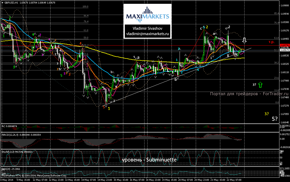 Очередная неудачная попытка фунта пробиться к уровню 1.70 на вчерашних торгах окончилась безрезультатно. «Быкам» не удалось преодолеть даже максимальный уровень среды 1.6921. В результате восходящий импульс угас, а курс пары возобновил нисходящую коррекцию. Этому способствовала и публикация совсем не впечатляющих данных бюджета и объёма ВВП Великобритании. Бюджет Англии в апреле стал дефицитным и составил минус 10.6 млрд. фунтов стерлингов против предыдущего значения – плюс 15.7 млрд. фунтов. Объём ВВП в первом квартале 2014 года по сравнению с предыдущим кварталом не вырос и был оставлен на уровне 0.8%. Однако при этом на снижение были пересмотрены многие компоненты ВВП. Внешняя торговля, которая раньше оценивалась как относительно положительный фактор, на этот раз оказала негативное влияние на экономику первого квартала. Экспорт по уточнённым данным упал на 1%, а импорт на 1.1%. Всё это вызвало в итоге новое падение британской валюты, курс которой на снижении достиг уровня поддержки 233-х дневной скользящей средней 1.6851. Таким образом, курс пары по всей вероятности завершил предыдущий откат и в настоящее время развернулся на продолжение нисходящего движения.