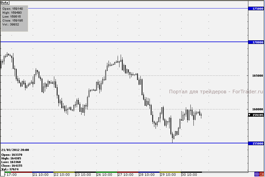 В пятницу, последний торговый день марта, на срочном рынке продолжала наблюдаться неопределенность. Фьючерс на индекс РТС консолидировался вокруг отметки 159 000 пунктов, при этом в течение дня его цена дважды пересекала отметку 160 000 и дважды опускалась до уровня 158 000 и ниже. В итоге – плюс 1,72% днем (это изменение рассчитано относительно закрытия дневной сессии, на самом деле весь этот рост произошел еще в четверг вечером) и 0,46% вечером.