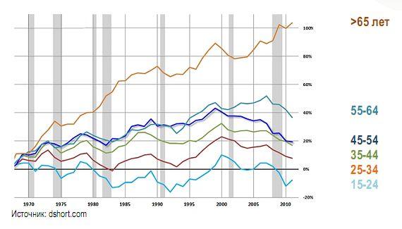 Реальный доход физических лиц США по возрастным группам: