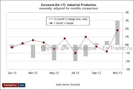 В ожидании отчета участники рынка будут задавать себе один важный вопрос: означает ли прирост промышленного производства в ноябре на 1,8% по сравнению с предыдущим месяцем, что подъем экономики набирает обороты? Такое мнение доминировало на рынке сразу после публикации Евростатом отчета за ноябрь в прошлом месяце. Тогда нетрудно было найти экономистов, которые считали, что такой результат — весомый аргумент в пользу теории о том, что положительная тенденция усиливается. Если это действительно так, то декабрьский отчет должен принести с собой новые доказательства. Однако шансы на то, что сегодня мы увидим такой же высокий показатель, невелики. Действительно, четыре основные экономики Европы уже представили свои данные за последний месяц 2013 года, и во всех отчет был отмечен спад.