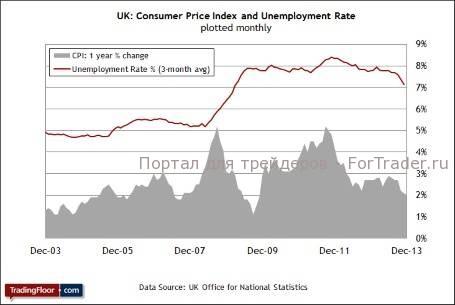 Безработица в стране падает быстрее, чем прогнозировал центральный банк, поэтому точка отсчета для повышения ставок, можно сказать, уже достигнута. Сейчас средний за три месяца уровень безработицы равен 7,1% (по состоянию на ноябрь прошлого года), то есть чуть выше целевой отметки Комитета по вопросам монетарной политики на уровне 7%, при достижении которой он намеревался рассмотреть возможность ужесточения условий политики. Банк всегда подчеркивал, что падение безработицы до 7% не приведет к автоматическому повышению ставок. Тем не менее, теперь, когда цель почти достигнута, причем намного раньше, чем ожидал Банк Англии, участники рынка гадают, будет ли сегодняшний отчет содержать что-то, что заставит их изменить ожидания.