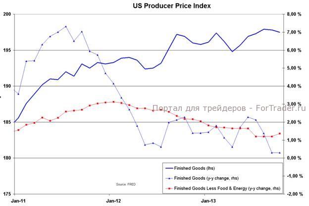 Ожидается, что в ноябре значение индекса будет равно нулю, при этом чистый индекс отметится ростом на 0,1%. В результате годовые темпы изменения цен на готовые товары практически не изменятся, а чистые цены в годовом исчислении вырастут приблизительно на 1,5%. Динамика цен снижалась с начала 2012 года, однако сейчас, по всей видимости, начала стабилизироваться. Несмотря на то, что индекс PPI, возможно, установил свое минимальное значение, признаков изменения тенденции пока нет. Индекс потребительских цен будет опубликован в следующий вторник, как раз чтобы помочь ФРС решить, сворачивать программу или нет. Данные будут опубликованы здесь.