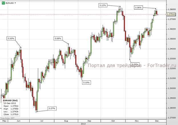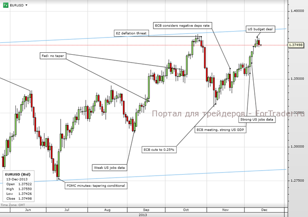 Год подходит к концу, но перед этим Федеральный комитет по операциям на открытом рынке проведет еще одно заседание на следующей неделе, в связи с чем рынки позиционируются в ожидании возможного объявления о сворачивании программы стимулирующих мер. США продолжают радовать благоприятной статистикой, и неопределенность вокруг переговоров о бюджете уменьшается. Все это может подтолкнуть ФРС к тому, чтобы объявить о начале сокращения покупок активов. Поэтому неудивительно, что американский фондовый рынок в последние дни сдавал позиции, а пара евро/доллар вчера уступила часть своих достижений.