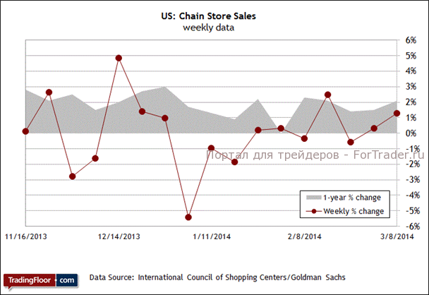 Данные в этом сегменте экономики за прошлую неделю, возможно, значат немного, но, в то же время, предлагают полезный контекст, так как помогут понять, восстанавливается потребление или нет. Предыдущий отчет свидетельствовал о том, что настроения улучшились. «Продажи в начале марта возросли» — говорится в пресс-релизе, посвященном еженедельному индексу продаж в сетевых магазинах, Международного совета торговых центров (ICSC) и Goldman Sachs. Показатель годового тренда повысился до 1,3% за неделю, окончившуюся 8 марта, зафиксировав лучший результат за три недели. Возникает вопрос: насколько реальна эта оценка перспектив на ближайшие недели. Сегодняшние данные помогут нам решить, что нас ждет дальше. Однако настоящее испытание для этого индикатора будет на следующей неделе, когда выйдет отчет, отражающий реакцию потребителей на судьбоносное решение Крыма, принятое им в воскресенье.