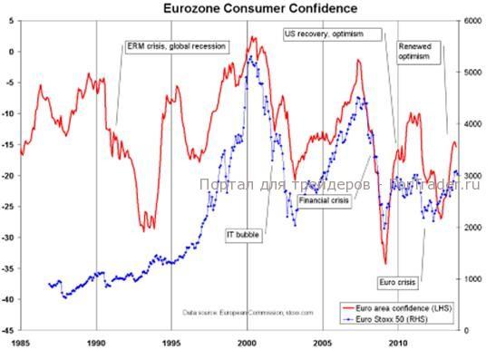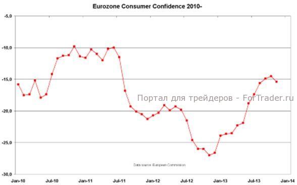 Индекс уверенности потребителей достиг своего нижнего предела после обещания президента Европейского центрального банка в июне 2012 года «сделать всё, что потребуется», что в результате привело к снижению доходности гособлигаций кризисных стран и закончилось изъятием банковских вкладов в силу опасений возможного банкротства. Ноябрьское падение стало первым ослаблением индекса с конца 2012 года. Восходящий тренд подтолкнул индекс уверенности потребителей к долгосрочной средней, что в общем-то странно, поскольку реальная экономика не улучшалась и безработица оставалась близ пиковых максимумов. Несмотря на то, что в настоящее время риск раскола Еврозоны низок и доходность суверенных облигаций находится под контролем, всё же трудно точно понять, что именно порождает оптимистичные взгляды. Последние три самых наивысших максимумов индекса были зафиксированы в 2000, 2007 и 2011 годах, и потом они уменьшались.
