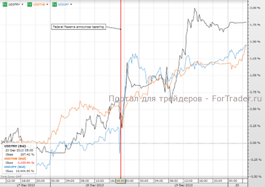 В то время как рынки сейчас восприняли объявление о сворачивании покупки активов относительного спокойно, большинство развивающихся рынков снова ощущают на себе негативное влияние этого события. Курс индонезийской рупии по отношению к доллару США опустился до пятилетнего минимума; южнокорейская вона также ослабла, равно как и малазийский ринггит и тайский батт. Доллар США по отношению к японской иене достиг новых максимумов. В Китае, дефицит наличных средств и высокие ставки межбанковского кредитования SHIBOR больно ударяют по ценам на активы. Если эти тенденции сохранятся, то они начнут влиять на экономический рост США в негативную сторону, что может привести к возможной паузе в «сворачивании».