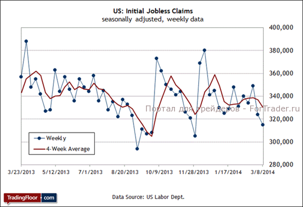 Этот опережающий индикатор снова улучшается. В двух последних отчетах количество новых заявок существенно сократилось, в результате чего показатель достиг минимального значения с ноября прошлого года. Хотя некоторые экономисты полагают, что сегодня возможна небольшая коррекция, количество заявок на уровне 325 000 (согласно среднему прогнозу) не сильно отличается от общего количества в размере 315 000, зафиксированного за неделю, которая закончилась 8 марта (с учетом сезонных факторов).