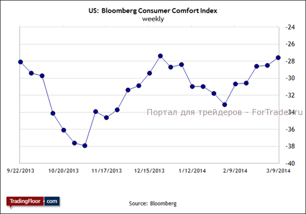 Публикуемый сегодня еженедельный отчет о потребительских ожиданиях принесет с собой свежую информацию и поможет ответить на вопрос, был ли февральский рост разовым всплеском активности или нет. В предыдущем выпуске индекс потребительского комфорта Bloomberg повысился в пятый раз подряд и достиг максимального уровня с конца декабря. Кроме того, индекс приблизился к самой последней вершине, которая была установлена в августе прошлого года, когда макроэкономические перспективы были очень радужными. «Улучшение перспектив в сфере занятости и снижение темпов увольнений способствовали росту доверия в широких слоях экономики» — отметил экономист Bloomberg на прошлой неделе.