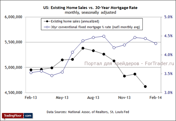 Коротко говоря, перспективы жилищного рынка остаются туманными, но, возможно, сегодняшние данные о продажах на вторичном рынке прояснят картину. В этом направлении тенденция в последнее время также ухудшилась. Продажи вторичного жилья, на которые приходится львиная доля всех сделок на рынке жилой недвижимости, в январе резко сократились и достигли минимального значения за период более одного года. «Суровая и долгая зима сказывается на разных направлениях экономической активности, и жилищный сектор не исключение, — заявил Лоренс Юн (Lawrence Yun), главный экономист Национальной ассоциации риелторов, которая публикует данные о продажах на вторичном рынке. — В то же время нельзя игнорировать такие негативные факторы, как ограниченное кредитование, низкий уровень запасов, рост цен и ипотечных ставок».