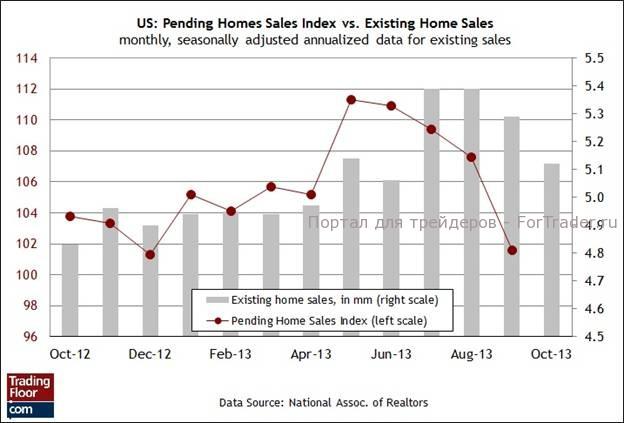 «Это вынуждает нас прогнозировать дальнейшее снижение продаж жилья в четвертом квартале и сохранения такой тенденции в 2014 году». Если этот прогноз чересчур пессимистичен, то мы увидим доказательства этого в сегодняшнем отчете. Согласно прогнозам экономистов, такое вполне возможно: консенсус-прогноз предусматривает умеренный прирост в октябре на 1,1% по сравнению с падением на 5,6% в предыдущем месяце.