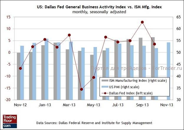 В частности, опубликованный на прошлой неделе индекс ФРБ Филадельфии отметился неожиданным ухудшением в ноябрьском отчете. В то же время самое последнее значение индекса PMI указывает на то, что общий тренд в этом секторе остается в силе. Если сегодня индекс ФРБ Далласа принесет с собой хорошие новости, то у игроков появится дополнительный повод ожидать, что важный индекс ISM в производственном секторе за ноябрь (публикация запланирована на 2 декабря) подтвердит обнадеживающий индекс PMI.