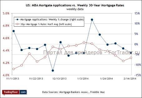 В феврале статистика на рынке жилья ухудшилась, в том числе в еженедельных отчетах о заявках на ипотеку. В последнем выпуске этот индикатор спроса на жилье понизился вторую неделю подряд. Главным источником ухудшения по-прежнему считается погода. Если это действительно так, что данные за прошлую неделю должны были немного улучшиться, так как погодные условия стабилизировались.