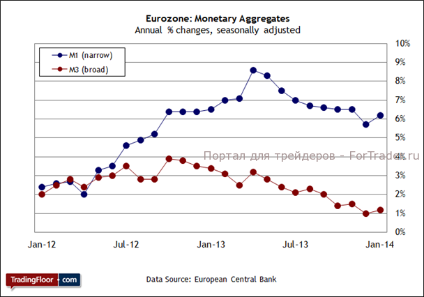 Появились и первые признаки того, что ЕЦБ не намерен ограничиваться лишь словами, а готов перейти к действиям. В предыдущем отчете денежные агрегаты М1 и М3 зафиксировали рост годовых показателей — впервые почти за год. Повторит ли февральский отчет эту позитивную динамику?
