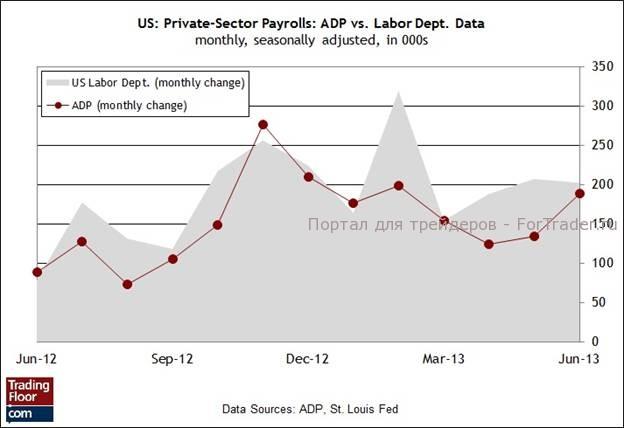 Однако избежать влияния отчета о росте ВВП, который выходит 15 минутами позже сегодняшнего отчета ADP, будет сложно. Далее запланирована публикация заявления Комитета ФРС по операциям на открытом рынке. Участники рынка наверняка будут усердно искать в нем намеки на то, когда центральный банк начнет сворачивать свою программу количественного смягчения. Безусловно, к моменту выхода заявления ФРС в 18:00 по GMT в нашем распоряжении будет дополнительный контекст для интерпретации заявлений Бернанке и других членов ЦБ. Этот контекст начнет формироваться с отчета ADP, который задаст тон для толкования последующих данных в плохом или хорошем смысле.
