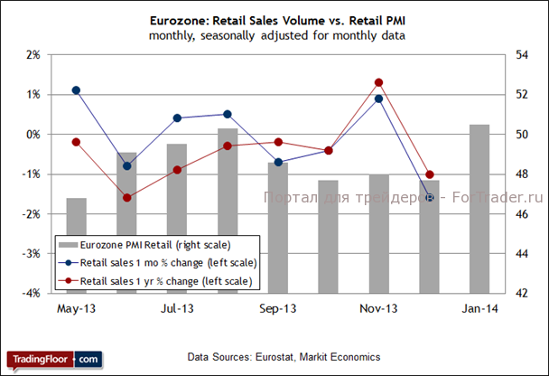 Пока что прогноз расходов в потребительском секторе Еврозоны в январе выглядит обнадеживающе благодаря подъему розничных продаж в двух основных экономиках региона. После декабрьского падения в первом месяце этого года в Германии и Франции был зафиксирован хороший прирост розничной активности, о чем свидетельствуют данные Евростата. Кроме того, индекс PMI в розничном секторе в начале 2014 года поднялся выше нейтральной отметки 50, что стало первым признаком роста за последние пять месяцев.