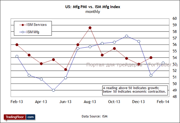 Обратите внимание на то, что в предыдущем выпуске индекс ISM в секторе услуг поднялся до уровня 54, установив максимальное значение с октября прошлого года. Конечно, о бурной активности здесь речь не идет, но это достаточно высокое значение для того, чтобы укрепить ожидания участников рынка, что сектор обслуживания, который играет доминирующую роль в экономике США, продолжит расти. Даже если прогноз сбудется и индекс в феврале слегка понизится до отметки 53,5, сегодняшний отчет (наряду с новостью об улучшении производственного индекса ISM, которая стала известна в понедельник) компенсирует возможные неутешительные новости о занятости по оценке ADP, которая выйдет чуть раньше.