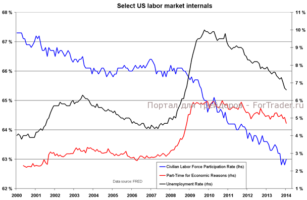 Но за общими результатами скрывается менее радужная картина. Количество людей, занятых частично по экономическим причинам, устойчиво держится на высоком уровне, хотя и постепенно снижается. Доля экономически активного населения находится в области исторического минимума, так как люди просто бросили поиски работы. В самом последнем отчете ISM о деловой активности в секторе обслуживания компонент занятости не оправдал ожидания аналитиков, что служит предвестником низкого результата в сегодняшнем отчете о занятости.